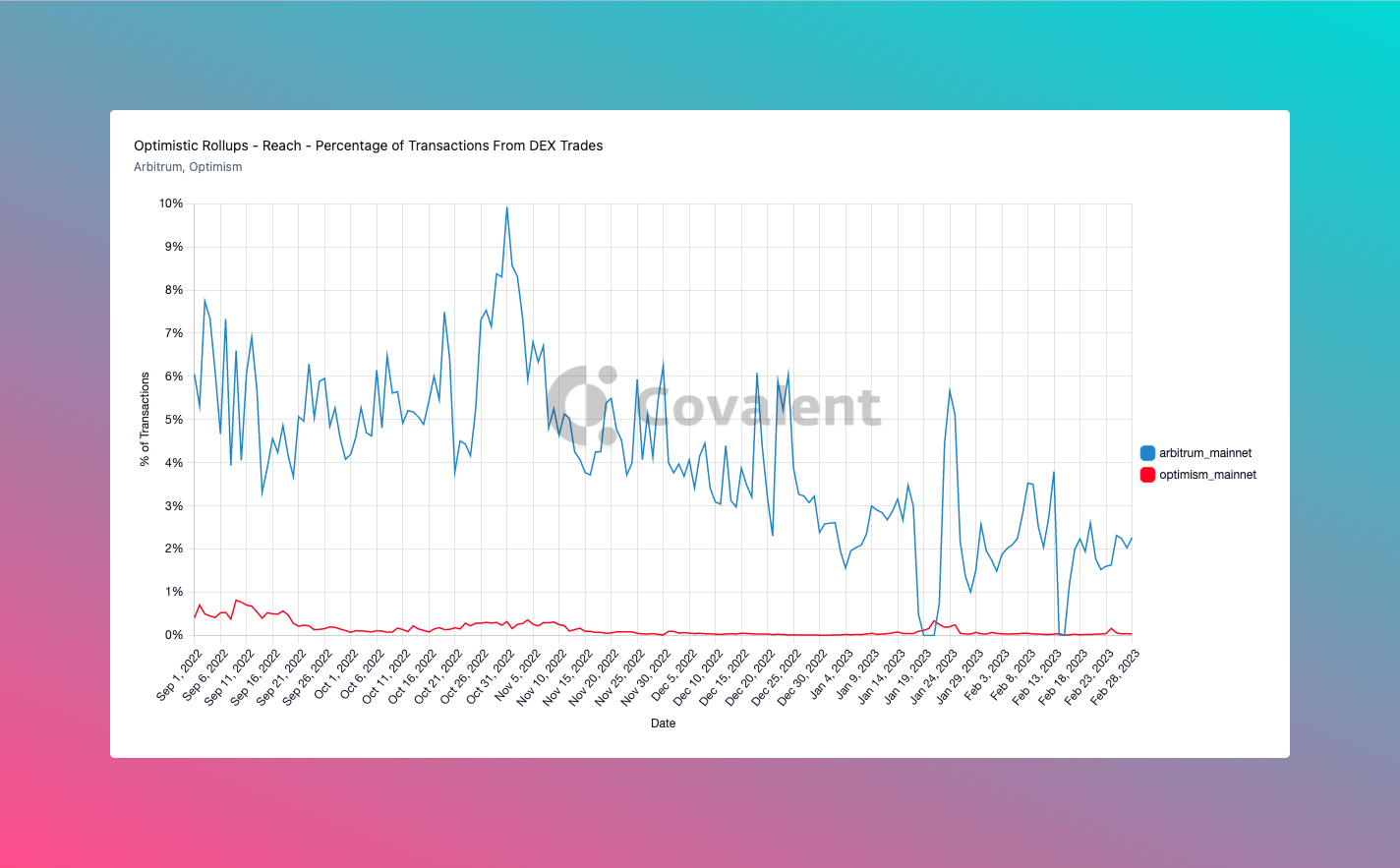 • Since the start of 2023, Arbitrum has been on an upwards swing, surpassing Ethereum’s daily transactions on February 21, thanks to the introduction of DEX Zyberswap, lending protocol Radiant, and derivatives protocol Vela Exchange. On March 16, Arbitrum’s daily transactions once again surpassed Ethereum’s after the announcement of their long-awaited governance token, ARB, and have held steady past the 1 million mark since.