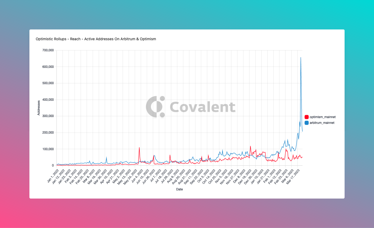 Covalent has been supporting Arbitrum and Optimism since early 2022 and offers a Unified API that allows developers to reuse queries across the two networks. Despite the turbulent events of the past year, Covalent data shows that both ecosystems have not only demonstrated remarkable resilience but also experienced incredible growth in activity and usage.