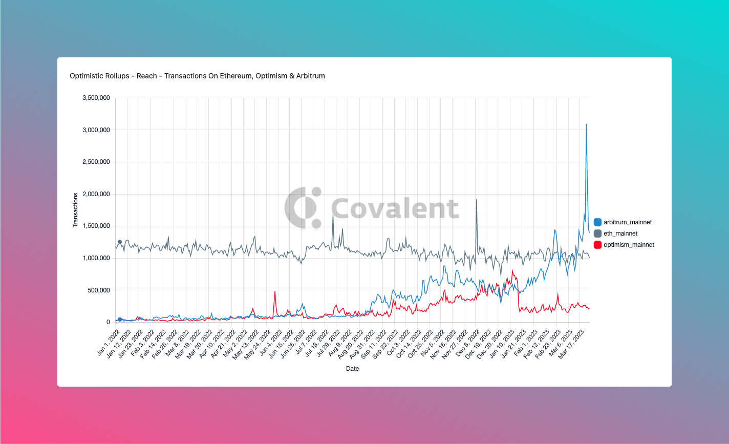 While both Arbitrum and Optimism share a common goal of enhancing the usability and affordability of Ethereum, each solution offers unique features that set them apart. In this blog post, we’ll conduct an in-depth comparison of the two Optimistic rollups using Covalent’s historical data, covering a range of onchain metrics, including transactions, active addresses, gas fees, developer activity, total value locked, and top dapps. We’ll also delve into their tech stacks, ecosystem developments such as Arbitrum Nova and Base, and growth outlook for 2023 and beyond.